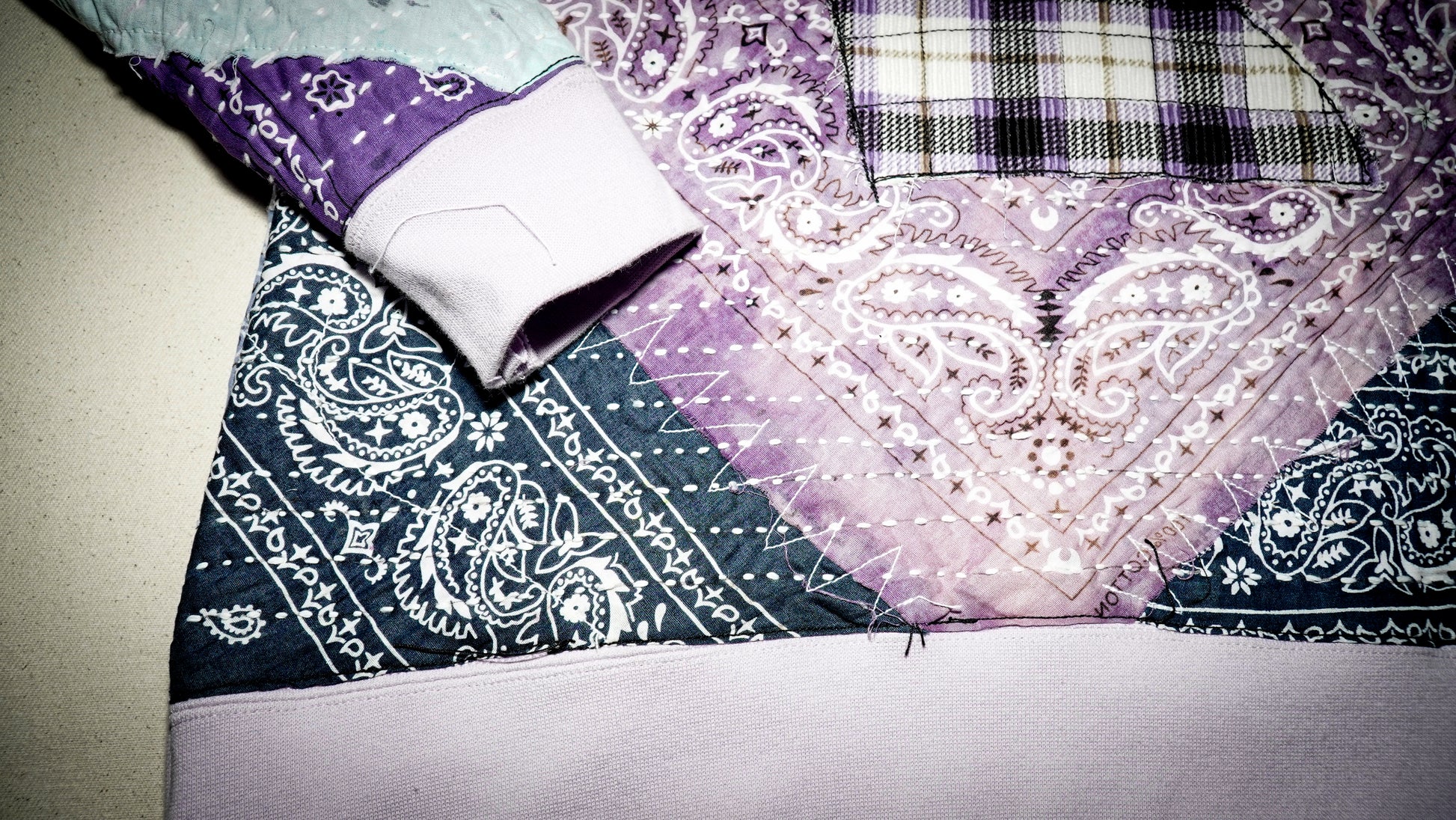 Japanese boro style crewneck sweatshirt with ice cream kid applique patch. This piece is hand sewn in sashiko style stitching originating in Japan, with a hand made applique patch sewn on. Says its size Large but it fits like a Medium now after the added layers and stitching.