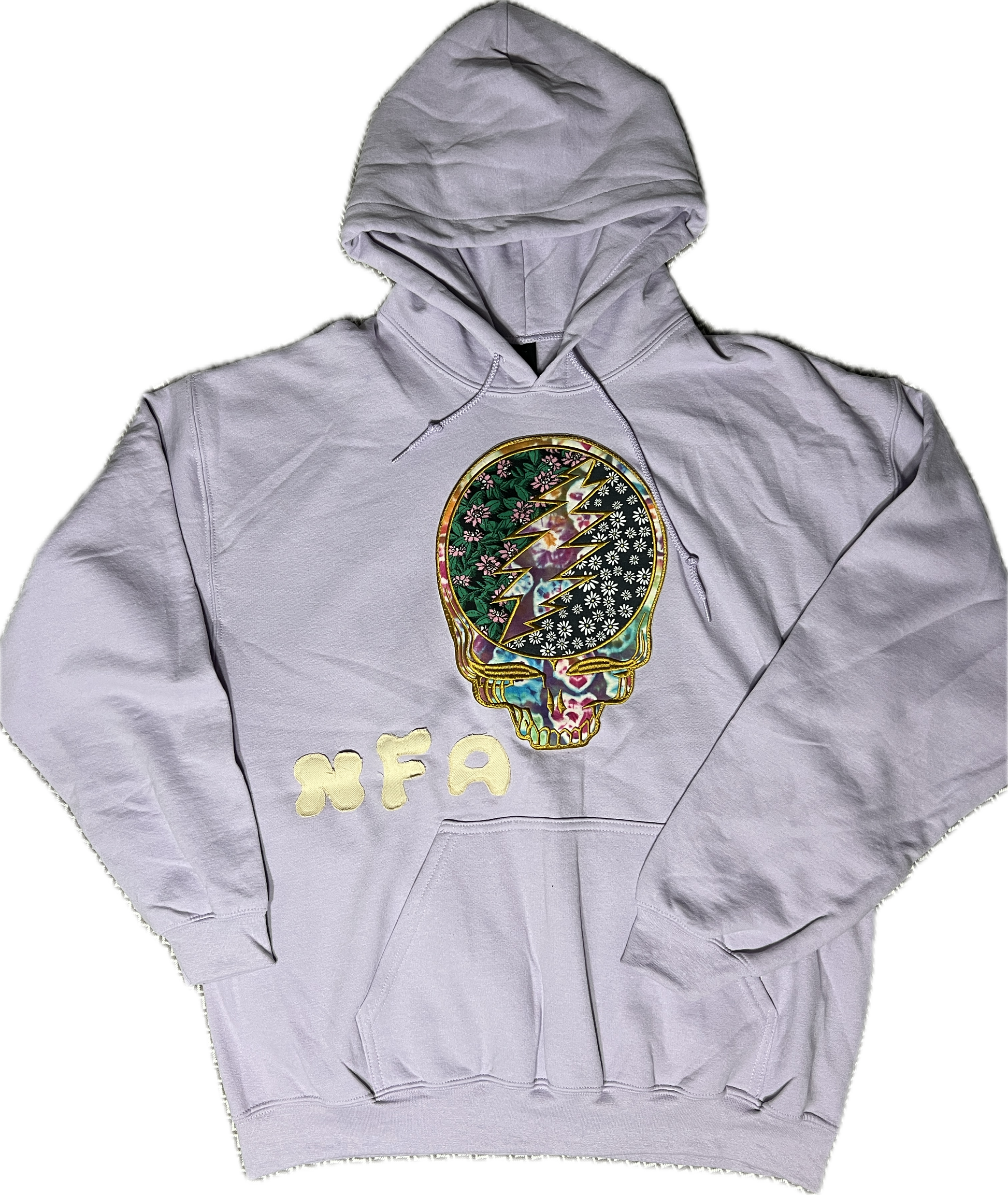 Purple NFA hoodie with patch. Every piece is one of a kind.